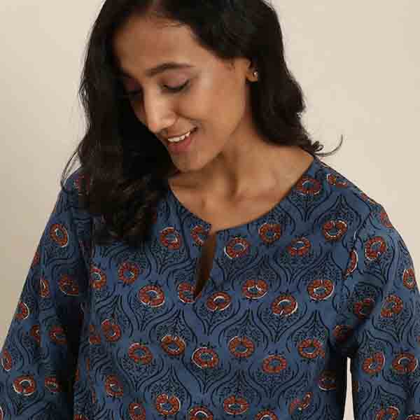 Blue & Black Indigo Dyed & Hand Block Print Floral Lounge Top