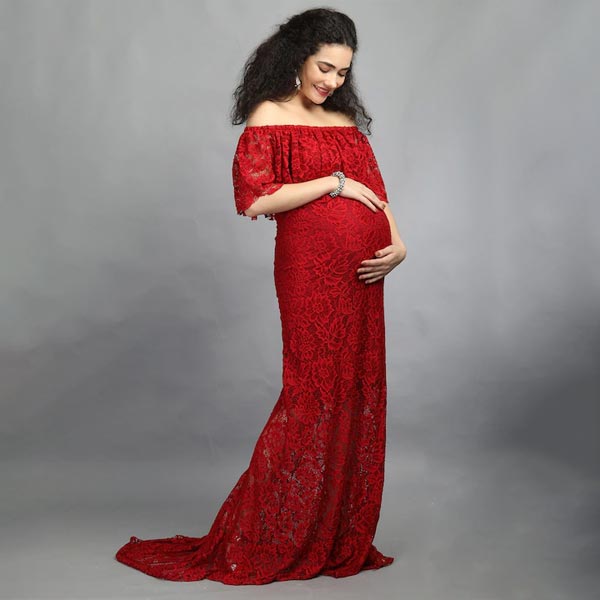 Maroon Off-Shoulder Lace Maxi Maternity Dress