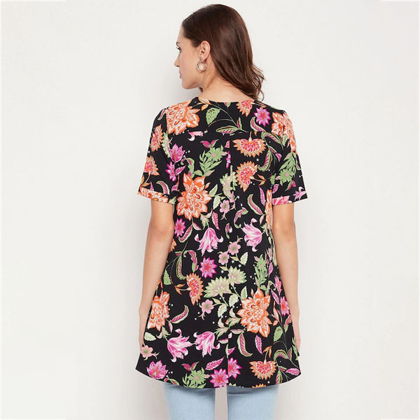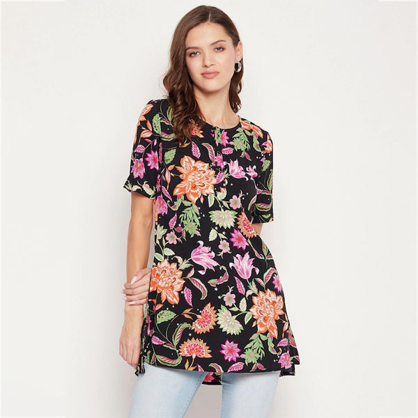 - Black and pink printed tunic ,has a round neck, short sleeves, button closure