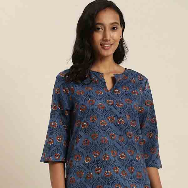 Blue & Black Indigo Dyed & Hand Block Print Floral Lounge Top