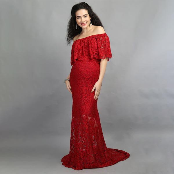 Maroon Off-Shoulder Lace Maxi Maternity Dress